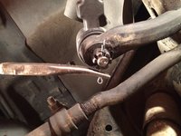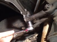 On the bolt head use the breaker bar and 17 mm socket; put the 17 mm box wrench on the nut on the back side of the arm.