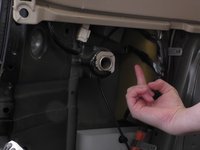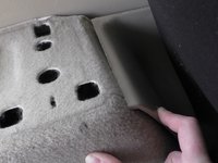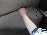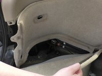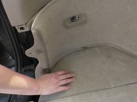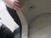 Starting in the car's trunk space, remove the plastic cover keeping the upholstery attached to the rear wheel well cover on the driver's side.