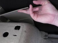 Underneath you will find 2 small black plugs keeping the upholstery attached to the car's frame. Remove them using the screwdriver to pry them out carefully so as not to damage the plugs.