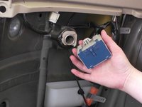 Reach up under the remaining hood of plastic in the space between the power outlet and the tire well cover. There will be a plastic square box clipped into the side of the car. This is the Lamp Failure Sensor.