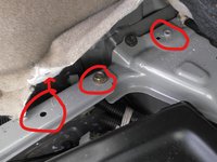 Next, lift up the panel covering the spare tire compartment using the small handle located beneath the carpet directly behind the door's latch. This will reveal 2 to 3 bolts holding down the upholstery to the car's metal frame.