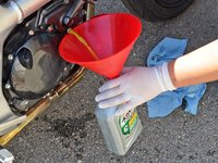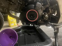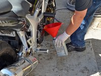Once the draining coolant has slowed to a drip, stand the bike up vertically to allow the last of it to drain.