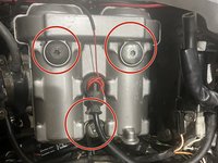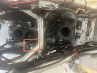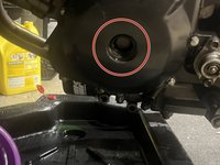 Locate the 10 mm hex coolant drain plug. It is on the right engine cover, just below the coolant outlet.