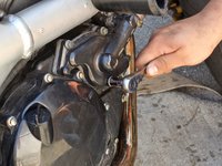 We will now bring our attention to the rear cam chain tensioner. Use a 10mm Socket and remove the middle screw. Grab your expensinve little 80 dollar tool and insert it in the middle and rewind the tension.