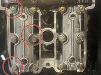 Use a 6 mm Allen Socket to remove all three of these. They hold the cover down on the front and rear heads.