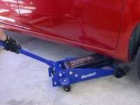 Do not put the jack under a body panel, as shown in this photo. Apart from the obvious damage to the vehicle, this incorrect procedure can injure or kill you. The jack should make contact with a sturdy, unpainted area of the vehicle's frame.