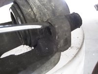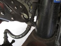 Remove the clip that holds the brake line to the strut with a pair of vise grips.