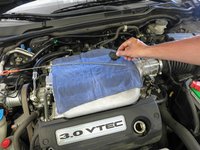 Set both aside. lay a towel over the engine block and set dipstick and the cap on that to avoid traces of oil.