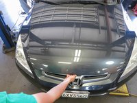Slide your hand under the hood, just above the Honda logo. Feel for a small rectangular lever. Pull the lever up, and lift the hood.
