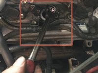 • Remove the intake brace support bracket by removing the two 12 mm bolts from the brace. Start by loosening the top bolt about halfway, then remove the bottom bolt completely. Now, loosen the top bolt the rest of the way and set aside.