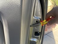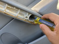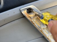 Use a Phillips screwdriver to remove the screws hidden under the armrest trim and at the bottom edge of the door panel.