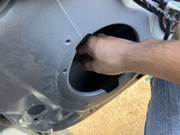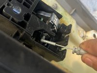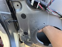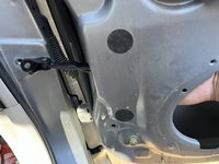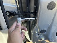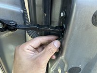 Reach into the access hole in the door panel to grip the door checker. Carefully slide it out through the hole.