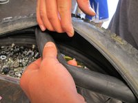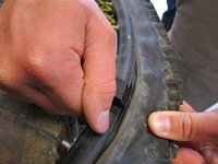 Hold the tire lever firmly in your hands and look for the boundary between the tire and the wheel rim. Apply great force to the lever until you pry the rim and the tire apart.