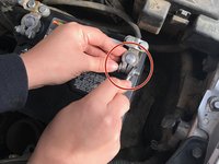 Then, remove the negative (orange circle) cable battery, using the wrench to loosen the nut and bolt.