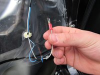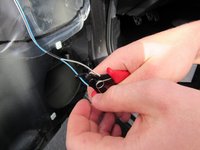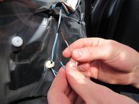 Using wire strippers, strip the two wires shown (blue and white, respectively) at about 1 inch from the end.