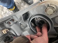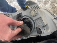 Start the new headlight installation by placing the headlight mount into the headlight housing and secure it with the clip by pinching the ends together and hooking it under the edges of the housing.