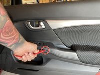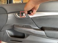 Use a trim panel tool to remove the cover behind the door pull or handle. Start by placing the tool at the back of the panel and prying the cover away from the door.