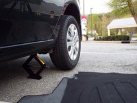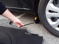 Lower vehicle, turning jack counterclockwise, until tire touches ground.