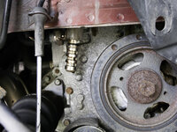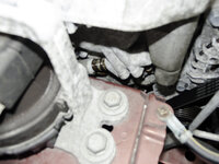 Removing the Exhaust valve timing control solenoid valve. Many YouTube videos will say to jack up the engine and remove the engine mount. You do not need to do this; the part can be replaced from below. The first photograph shows the solenoid's position viewed from above. As you can see, the engine mount blocks access to it from above.