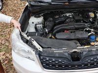Open the hood of your car by locating and pulling the hood release found on the driver side dash just below (and to the left) of the steering wheel. Then move to the front grill of your car and pull the latch located under the Subaru symbol.
