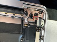In red you can see the two connectors for the Touch Bar. We will need to remove other parts first to be able to free them and be able to install the new connectors.