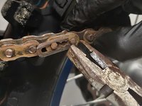 Use a mallet and flathead screw driver to pry off the master-link side plate.