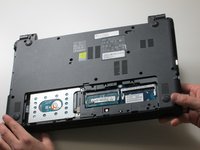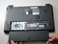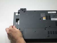 At the same time, grasp the battery with your other hand and slide it out of the laptop.