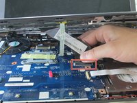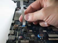 Unplug the large ribbon by sliding the retainer clip backward (toward the hinges), then gently pulling the cable out of the connector.
