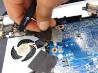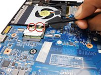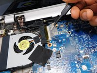 Use tweezers to gently detach black and white Wi-Fi card cables shown here by lifting up until they pop off.