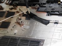 Use tweezers to gently lift the tape holding down the white cable until tape is unstuck. Unthread black and white cables until free of the bottom panel.