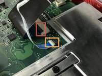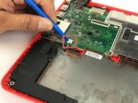 Using the plastic opening tool, disconnect the audio connector by pushing the audio tab toward the speakers.