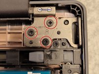 • Remove the remaining 5 screws (2 on the left side and 3 on the right) holding down the screen assembly to the backplate and motherboard assembly. Marked with debossed triangels in the metal.