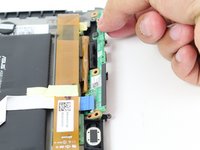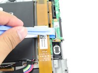 Use Plastic Opening Tool to pry off the clip located towards the bottom of the button component near the metallic strip with a blue end, capped by the black button clip.