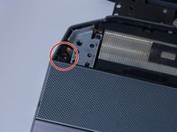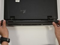 Flip the laptop over and pop the back cover off behind the screen, by grabbing it on either side and pulling it up, vertically off of the laptop.