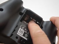 Depress the button on the battery compartment. Pull the compartment away from the controller and then slide it out.