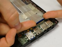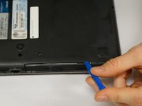 • Remove the L shaped panel with the plastic opening tool by inserting it into the indent along the USB port side of the laptop.