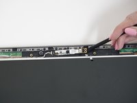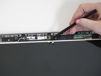 Use the pointed side of the black spudger to remove the metallic stickers by the circuit board of the camera above the screen.
