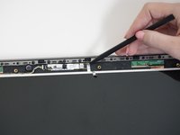 Insert the plastic opening tool into the crack where the plastic of the screen's frame meets the shell at the top.
