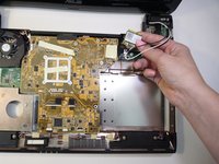 Find the Wi-Fi chip circuit board, which has a white sticker on it and is connected to a black and white wire.