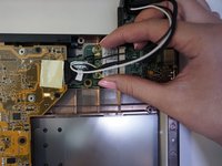 Unlatch the clip attaching the white flattened flexible cord with a blue tip to the circuit board with your thumb.