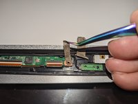 Use fine tip tweezers to slide the left ribbon cable out of the connector.