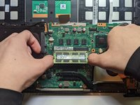 Hook a thumbnail in each of the metal retainers on either side of the RAM module and spread them apart slightly.