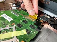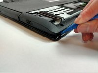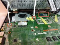 Using the plastic opening tool, flip up all three gray tabs and remove the ribbon connectors from the motherboard.