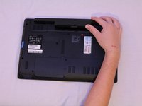 Flip the laptop over so the bottom side is face up.
