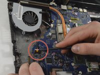 Disconect the fan power cable using the spudger to push the connector out.