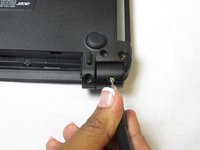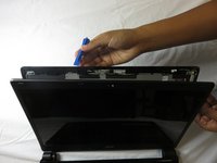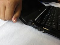Locate the screws connected to the hinge of the laptop. Small, black stickers hide them from immediate view.