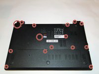 Using a Phillips 1 screwdriver, remove the 17 9 mm screws from the bottom of the laptop, including the one in the back panel.