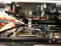 Using a pair of tweezers, disconnect the small white ribbon cable from the connector near the left side of the device.