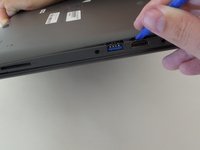 Insert the plastic opening tool into the divet of the back panel located above the HDMI port.