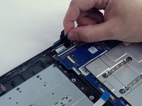 Lift the wider hinge located at the top of the motherboard holding another grey strip cable.